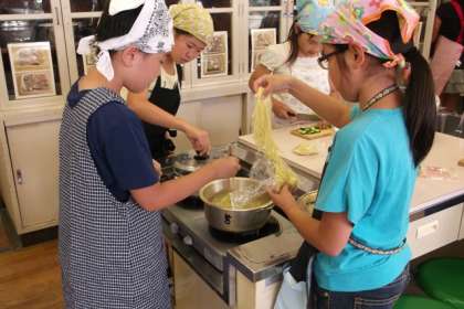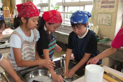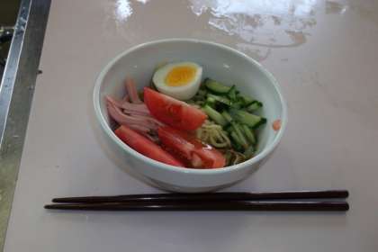 5年生はエコ食調理実習に引き続き、みんなで協力して、これからの季節にぴったりの「冷やし中華」にチャレンジしました。冷やし中華に入れたゆでたまごは前回のエコ食の経験をいかして、沸騰したお湯に12分間卵を入れて作る方法で作ってみました。