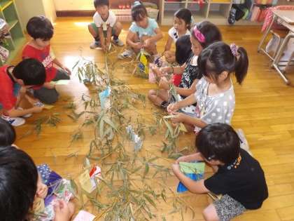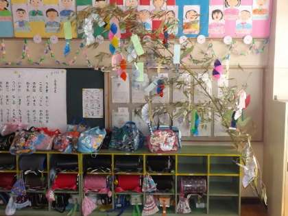 1年生にとっては,短冊や飾りをしっかり糸で結びつけるのも勉強です。今回,笹は,「竹と親しむ公園」から頂きました。ありがとうございました。