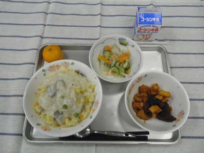 キャロットライスホワイトソース じゃがいもとレバーのケチャップあえ だいこんじゃがサラダ 冷凍みかん 牛乳