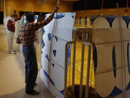 130周年のために,連日,江戸川凧の愛好会の方が学校においでくださっています。今日は,体育館ギャラリーに大凧を飾ってくださいました。