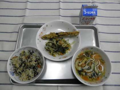 ひじきごはん ししゃものごま揚げ 野菜のナッツ和え きのこ汁 牛乳