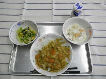 カレーライス 小松菜サラダ フルーツヨーグルト ジョア