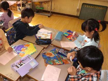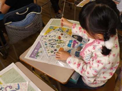 130周年のお祝いの日に飾るため,1〜4年生は「ダイヤ凧」を作っています。“初めて”の1年生も,個性的な作品に取り組んでいます。