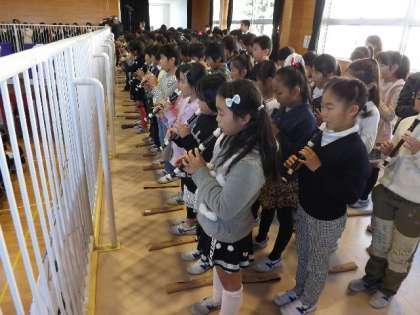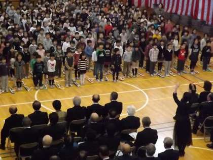 式典終了後,1〜5年生のアトラクションをご覧いただきました。「ふるさと」の歌と合奏「パッフェルベルのカノン」をしました。「ふるさと」は,会場の皆様も一緒に歌ってくださいました。