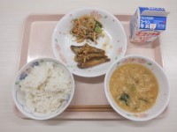 〈こんだて〉・むぎごはん・ぎゅうにゅう・タラのうめみそやき・こんにゃくのいために...