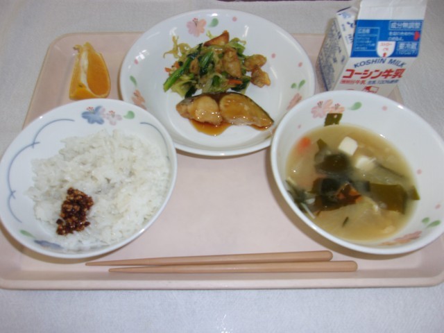 ごはん ごま昆布ふりかけ 鰆の照り焼き 小松菜と揚げあさりのピリ辛和え 豆腐のみそ汁 デコポン