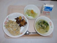 きゅうしょくのカレーは、一から手作りします。ルーは○○カレーのもとを使うのではなく、こむぎことバターでルーを作り、あじはちょうみりょうを組み合わせて作っています。きょうはこまつなとチキンを使ったカレーです。