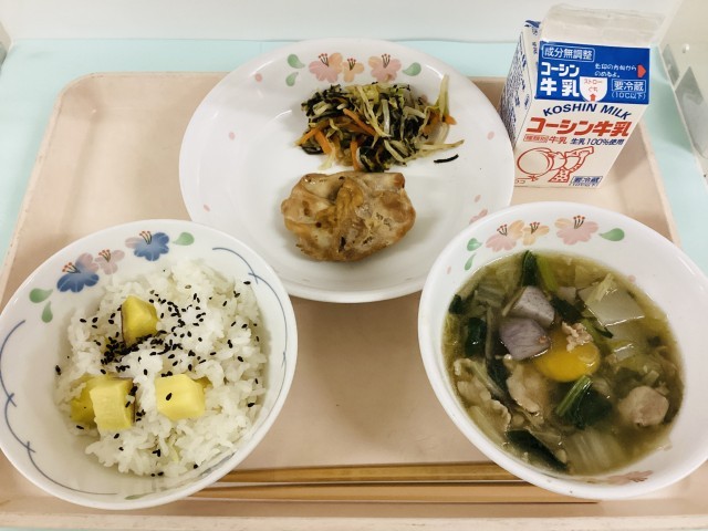 さつまいもご飯・鶏の照り焼き・磯香あえ・月見汁・牛乳