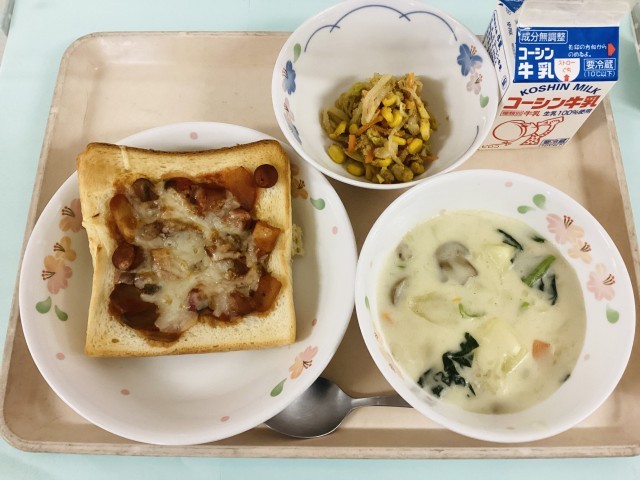 森のピザトースト・ごまだれサラダ・ホワイトシチュー・牛乳