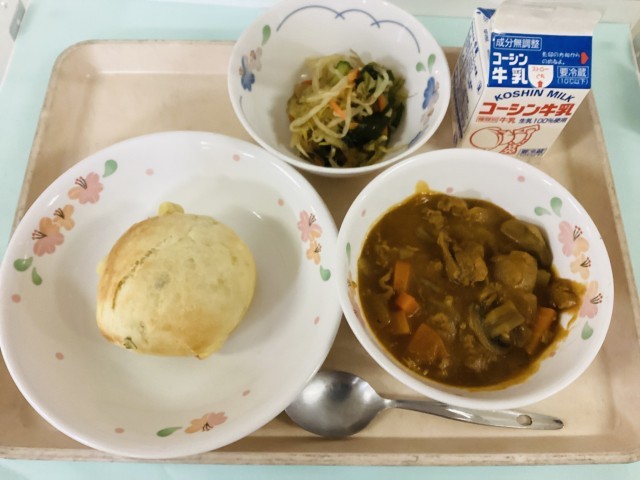 手作りさつまいもパン・海藻サラダ・ハンガリアンシチュー・牛乳
