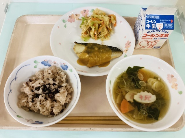 赤飯・鯖の味噌だれがけ・かわり漬け・すまし汁・牛乳