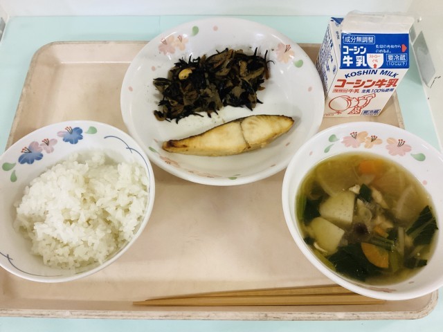 ごはん・魚(さわら)の西京焼き・五目ひじき・のっぺい汁・牛乳