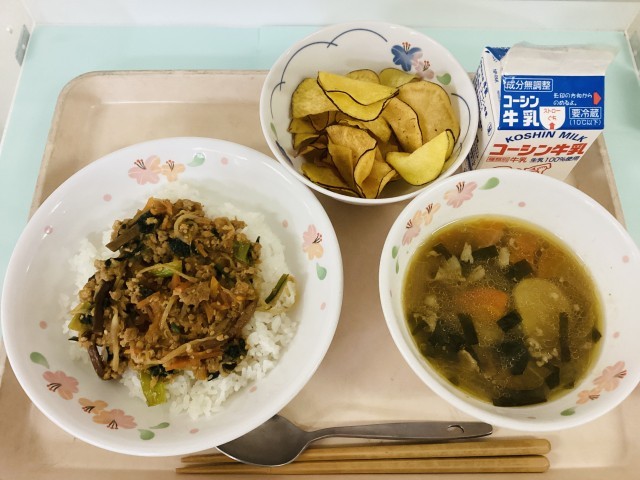 まぜまぜビビンバ・トックスープ・さつまいもチップス・牛乳