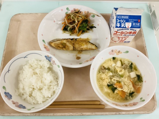 ごはん・魚のごまみそ焼き・おかかあえ・むらくも汁・牛乳