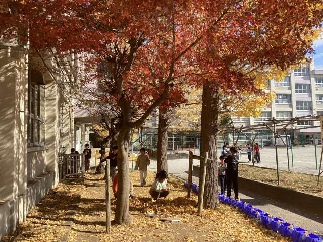 2年生は、図工の造形遊びとして、校庭の落ち葉や枝などで思い思いに遊びました。