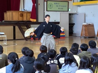 本日は、能楽シテ方観世流の松山隆之様(元本校PTA会長苅部隆之様)に能楽の出前授業をしていただきました。能楽の歴史についてお話しいただいたり、「羽衣」の台詞を一緒に読んだりなどして、演劇特有の表現に触れることができました。また、能で使われている能面は、見る角度や光で表情が変わって見えることを教えていただき、実際に角度を変えて見てみると、表情の違いを感じることができました。