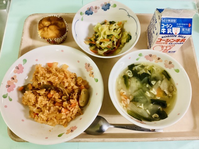 ポークケチャップライス・ガーリックドレッシングサラダ・ABCスープ・ヨーグルトポムポム・牛乳