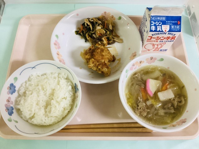 ごはん・とり天・切干し大根の含め煮・タイピーエン・牛乳