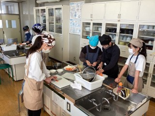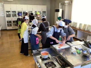 安全に気をつけて、グループ毎に協力して食材を切っています。