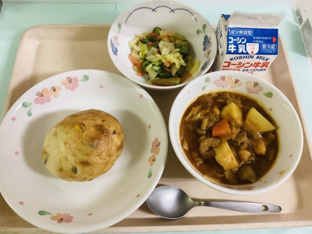 手作り小松菜ベーコンパン・オニドレサラダ・豚肉のトマト煮・牛乳