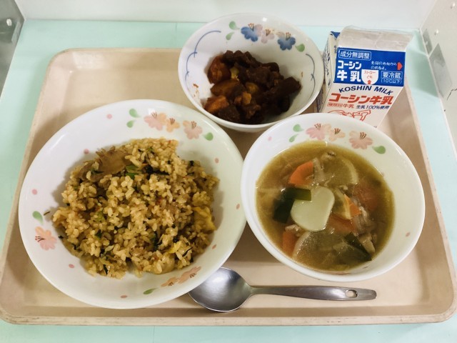 キムチチャーハン・レバーとポテトのケチャップあえ・トックスープ・牛乳