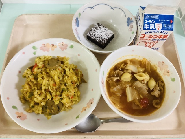 カレーピラフ・ミネストローネ・ガトーショコラ・牛乳