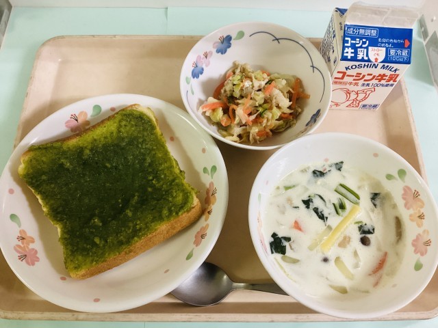 小松菜ビスキュイパン・焼肉サラダ・チキンクリームスープ・牛乳