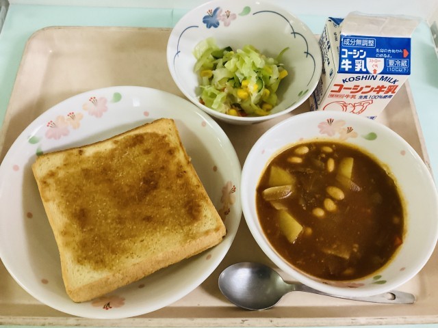 セサミトースト・フレンチサラダ・ポークビーンズ・牛乳