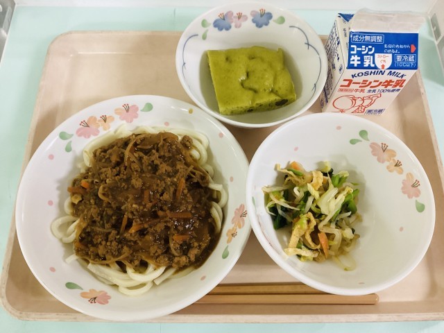 肉みそあんかけうどん・野菜のおろしあえ・抹茶蒸しパン・牛乳