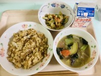 ビビンバの具は、肉そぼろ、炒りたまご、小松菜ともやしのナムル、切干大根とキムチの炒め物でした。具だくさんで、いろいろな味や食感が楽しめました。野菜がたっぷり入っていましたが、肉やたまごがあることで食べやすくなり、野菜が苦手な児童も残さず食べられました。