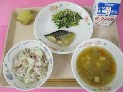 梅ごはん 牛乳 さばの文化干し しらす入り煮浸し 雷汁 バナナ