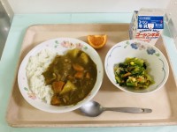 この日の献立は、小岩二中、南小岩小、篠崎五小と同じ献立です。里芋ごはん、はるやまのはす蒸し、おふのすまし汁、かにかまのごまあえ、みかん、牛乳でした。