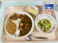 6月24日の給食は、ご飯、小松菜ふりかけ、ポテトコロッケ、ゆでキャベツ、すりごまの味噌汁、キウイ、牛乳でした。