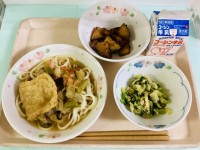 きつねうどん・青菜とツナの和物・大学芋・牛乳