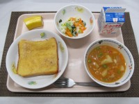 〇ハニーフレンチトースト〇牛乳〇鶏肉のシチュー〇キャベツとコーンのサラダ〇果物(...