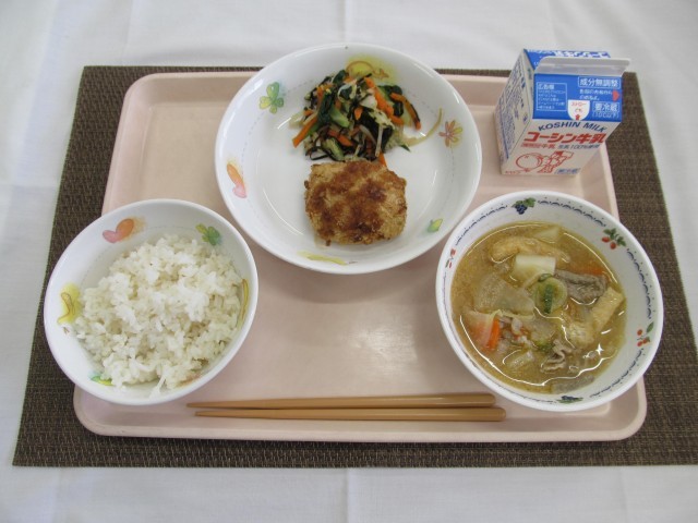 12月12日の給食 公開日 2025/12/16 更新日 2025/12/16 学校日記 〇ご飯〇牛乳〇キャベツ入り魚メンチ〇磯香和え〇ごまみそ根菜汁キャベツ入り魚メンチは、鳥取県産のアジミンチを使い、食べやすいように鶏ひき肉も加えました。キャベツがたっぷりで野菜もたくさんとれるメンチカツでした。