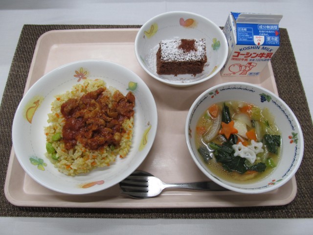 お星さまのマカロニスープは星型にんじんと米粉マカロニを入れ、ココアケーキは粉糖とココアパウダーで星の模様を描きました。星型にんじんは、各クラス10枚ずつ入れたので、当たった児童は嬉しそうな表情でした。