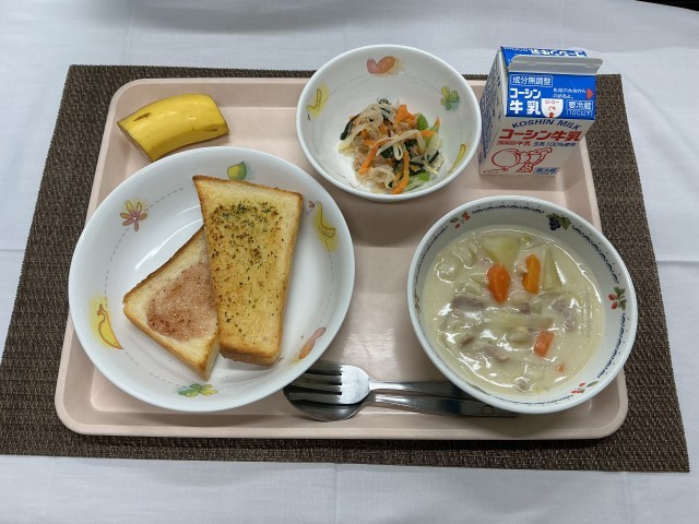 4月15日の給食 公開日 2026/04/15 更新日 2026/04/15 学校日記 ◯ガーリックトースト(1/2) いちごジャムトースト(1/2)◯牛乳◯豚肉のクリームシチュー◯もやしとツナのサラダ◯果物(バナナ)