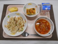 〇高野豆腐の米粉ドライカレー〇牛乳〇フライドポテト入りサラダ〇りんご寒天 「みん...