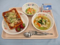・ピザトースト・パスタサラダ・あさりとレンズ豆のスープ・いちご・牛乳