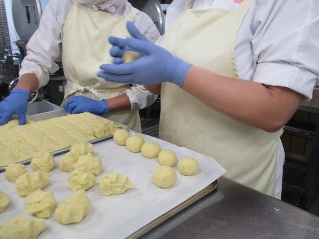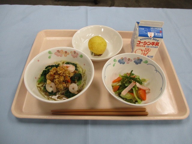 担仔麵は台湾料理のひとつで、あっさりとしたスープと肉そぼろが特徴です。かつて漁師が漁に出られない時に、天秤棒を担いで麺を売り歩いていたそうで、その棒のことを担仔(タンツー)と呼んだことから、この名が付いたと言われています。地瓜球はさつま芋をふかし、タピオカでん粉を加えて丸め、油で揚げた台湾屋台では定番のスィーツです。教室では給食当番が麺、スープ、肉という具合に分担して、どのクラスも上手に配膳していました。