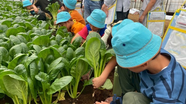 小松菜農園では、小松菜を育てる工夫や収穫方法などのお話を聞き、収穫体験をさせていただきました。