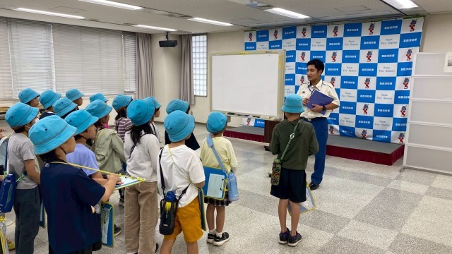 消防署では、通報から出場までの流れについて聞いたり、消防署内の見学をさせていただいたりしました。