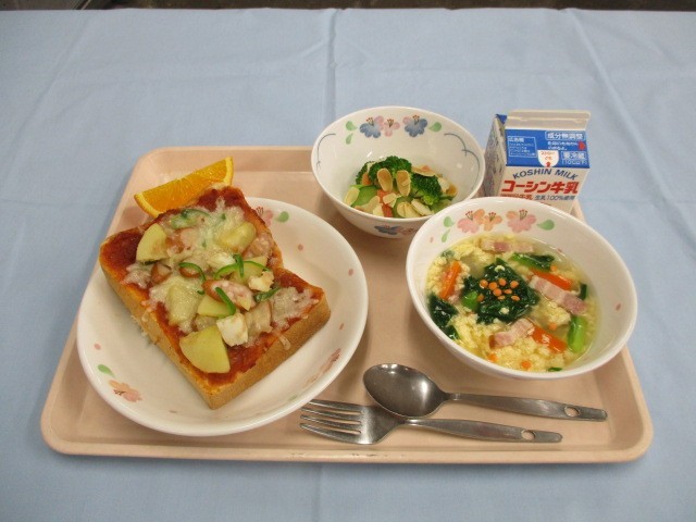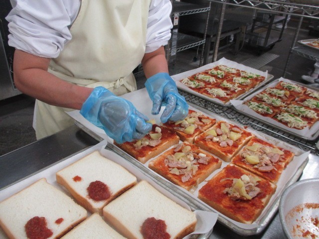 食パンにトマトソースを塗り、じゃが芋を入れた具を乗せ、ピザチーズを振り、オーブンで焼きました。ソースはパンの角まで丁寧に塗り広げます。それぞれの担当がきびきび動いて、ピザトーストが次々と焼き上がっていきます。