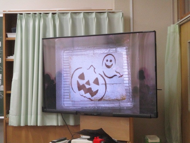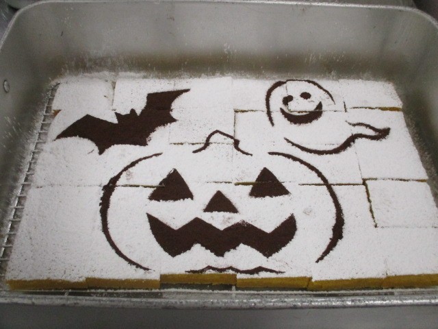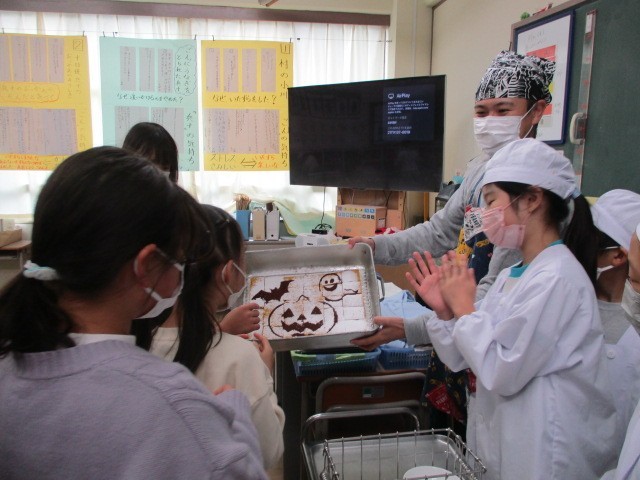ハロウインは、夏の終わりと冬の始まりを告げる収穫祭でした。また、古代ケルト人にとって1年の終わりであり、この夜には死者の霊が訪ねてくると信じられていました。身を守るために仮装したり、焚火をしたりしたのがハロウインの始まりと言われています。現在では宗教的な意味合いとは別に、仮想を楽しんだり、お菓子をプレゼントし合ったり、ホラーを楽しんだりするイベントとして多くの国で親しまれ、日本でも秋に楽しむ行事のひとつとなっています。給食室ではかぼちゃのケーキを焼き、かぼちゃの絵を描いて教室に届けました。教室で担任の先生が配膳前にみんなを集めて見せたり、大きな画面に映して見せたりして給食室の想いを伝えてくれていました。驚いたことに高学年はもちろん、低学年からも「去年と絵が違う~」という声が聞こえてきたことです。確かに、今年のデザインは図工の高橋先生の新作でした。先生方がみんな、給食にも愛情を注いでくださっている、これも清新ふたば小学校の魅力です。