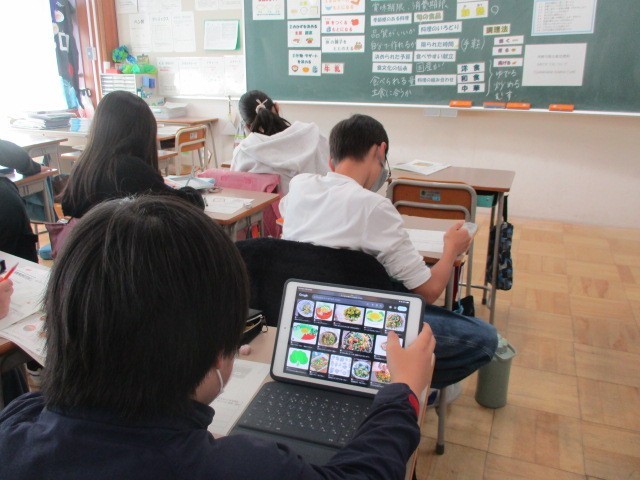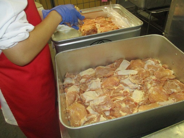 肉屋さんから届いた鶏肉の切り身も1枚1枚異物が付いていないか、肉の色や状態は良好か、両面を確認してから下味に漬けます。パン粉をひとつまみ振って、オーブンで焼きました。6年生の献立作成の授業が3クラスすべて終了しました。食品の基本的な分類や役割なども理解できており、どのクラスも意欲的で真剣に取り組んでいたので、献立の出来上がりが楽しみです。