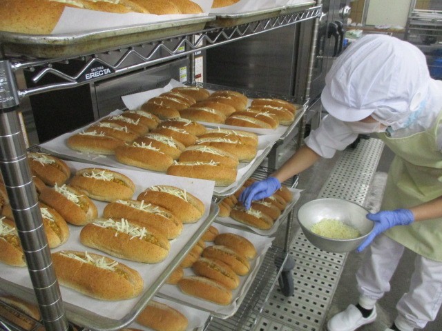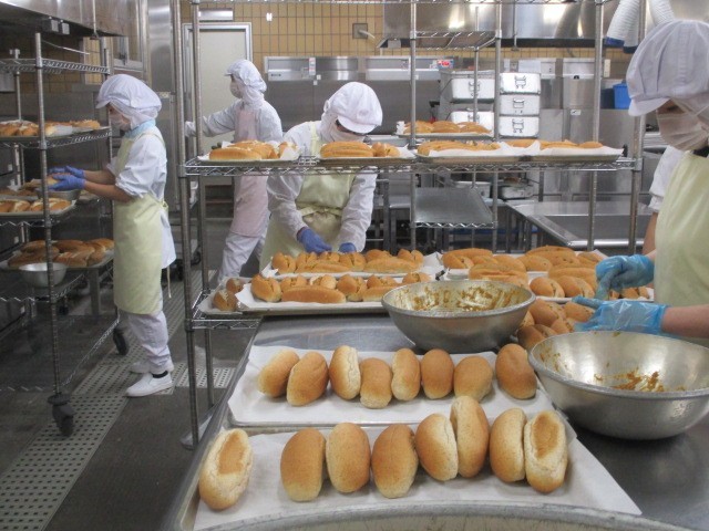 ひき肉に大豆のみじん切りを混ぜて野菜と炒め、チリパウダーで味付けしました。胚芽コッペパンに挟んでピザチーズを振り、オーブンで焼きました。具やチーズの量がみんな同じになるように気を配ります。クラムチャウダーの野菜は大きさを揃えて角切りにし、見た目にもきれいに仕上げました。