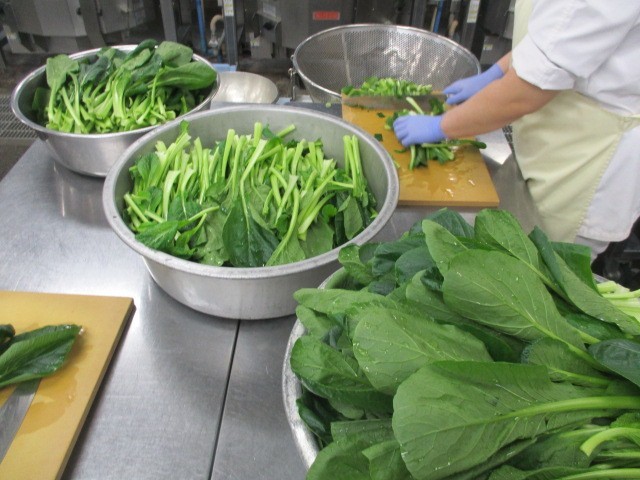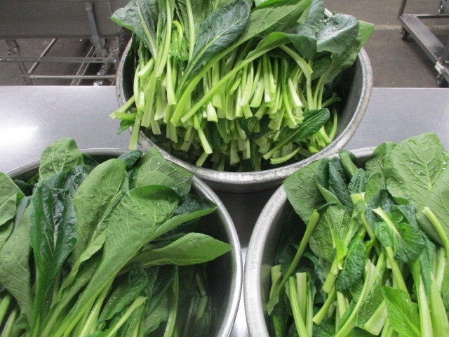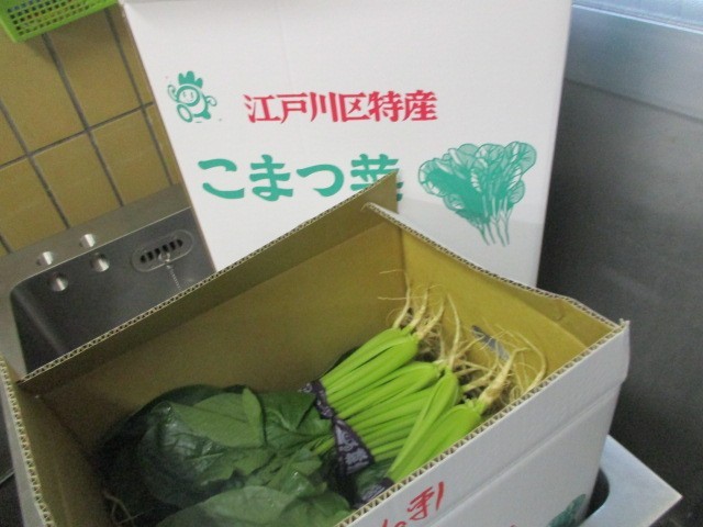 江戸川区小松菜一斉給食でした。「JAスマイル農業協同組合」の協力の下、区内の全小中学校に無償で小松菜が届けられました。次代を担う子ども達に地場産の新鮮な小松菜を食べて、農業について理解を深めてもらうことが目的です。小松菜はカルシウムが豊富に含まれ、鉄やビタミンAも多く含まれています。江戸川区産の小松菜を食べれば配送にかかるエネルギーも抑えられ、SDG’sにもつながります。たっぷり届けられた小松菜は、給食室で三つの料理に分けてすべて使いきりました。