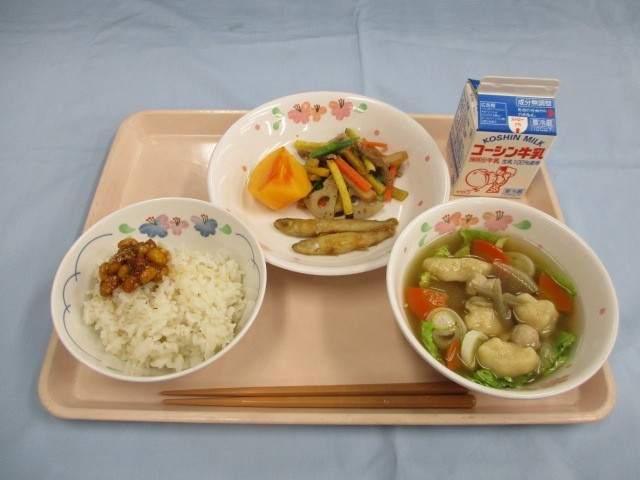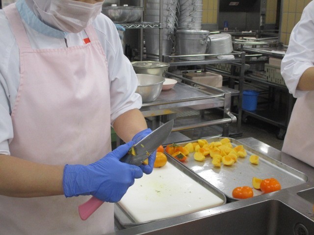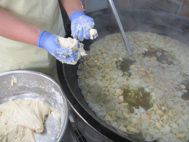 薄力粉に豆腐を混ぜて汁の中にすいとんを作りました。お餅のようにモチモチしたすいとんはお腹にたまるし、体も暖まります。食料不足の時代には小麦粉だけでなく雑穀なども混ぜ、さつま芋の葉などを具にして作られてたそうです。今では具材も豊富で、各地の郷土料理として見直され、親しまれています。柿は形が独特なので皮むき器で皮をむくことができないので、96個すべて手でむきます。食べてくれる人たちの顔を想像しながら、丁寧にむいていきます。