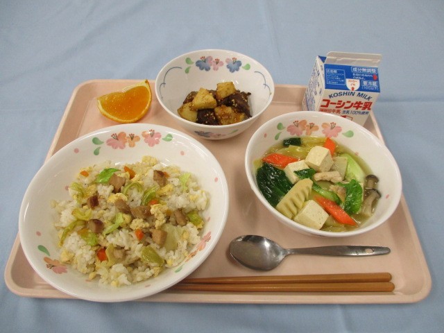 江戸川区産の小松菜を青味として給食ではよく使用するのですが、中華なので青梗菜を使いました。果物は紅マドンナという名前の国産オレンジです。皮が薄く、甘みの強いオレンジです。これから春先にかけて色々な国産オレンジが出回ります。野菜や果物には数多くの種類があることは、知ってもらいたいことのひとつです。12月に入り、今年も残りわずかとなりました。勉強と同じように、給食も2025年のまとめの月になって欲しいと思っています。
